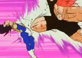 Meanwhile, we are shown another action replay: however, with Vegeta still underwater, it appears we haven't missed much. Suddenly, Vegeta slams into Recoome's midriff, but his attack has little effect, and Recoome uses a piledriver to smash his opponent into the ground. Chuckling to himself, Recoome picks Vegeta out of the ground, which amuses Krillin no end. Beginning to trash-talk again, Recoome is then subjected to a sudden blast from Vegeta, knocking him over and causing him to let Vegeta go. The audience voice their dismay, but Recoome is quickly back on his feet, and concludes his speech. He then prepares to fire his Eraser Gun attack, which Burter is quick to notice. Announcing his attack, Recoome sends his blast straight at Vegeta, but his mouth is slammed shut by Krillin, whilst Gohan manages to move Vegeta out of the way, saving his life.